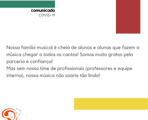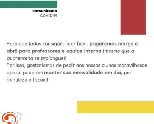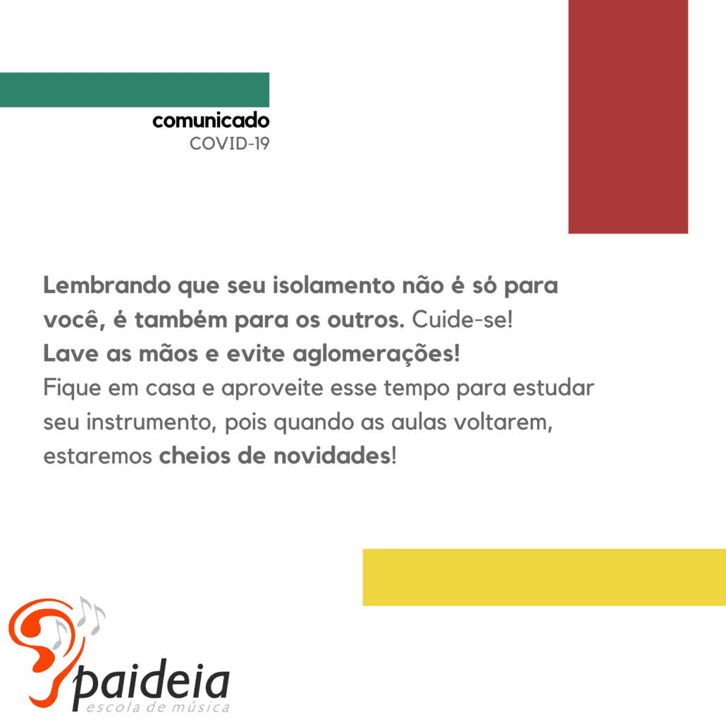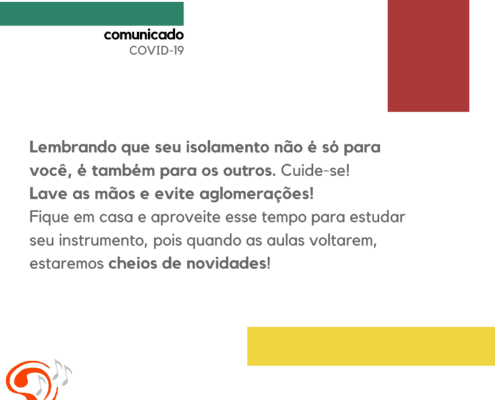 Seu isolamento não é só para você, é também para os outros. Cuide-se! Siga as recomendações básicas divulgadas pelo Ministério da Saúde e aproveite esse tempo para estudar seu instrumento, pois quando as aulas voltarem, estaremos cheios de novidades!