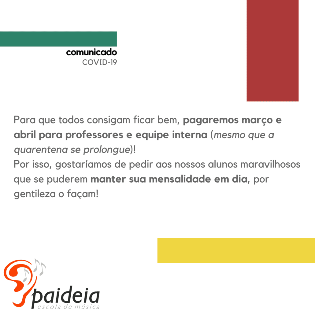 A Paideia se comprometerá a pagar inteiramente o mês de março para equipe interna e professores. Além disso, sabemos que a situação de quarentena pode se estender durante o mês de abril. Caso aconteça, nosso posicionamento em relação ao pagamento de nossos funcionários será de pagar 100% do salário para equipe interna; já para os professores, pagaremos 100% do valor dos alunos que manterem suas mensalidades em dia e 50% do valor dos alunos que, por diversos motivos, não puderem assumir a mensalidade deste mês. Por este motivo, pedimos para quem possa manter sua mensalidade em dia, o façam, visando responsabilidade coletiva, para que nossos profissionais possam se manter e ficar em quarentena.