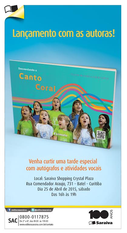 Com o objetivo de desvendar as várias modalidades das vozes, as autoras e pesquisadoras musicais Clarice Miranda e Liana Justus, lançam o livro “Desvendando o Canto Coral” com a assinatura da Editora Formato (Saraiva). O livro é recomendado para o público Infantojuvenil e será lançado no dia 25 de abril das 16 às 19 hrs, na Livraria Saraiva do Shopping Crystal em Curitiba. Durante o lançamento acontecem duas apresentações dos corais Lumen e Por Todo O Canto, às 16h30 e 17hrs respectivamente.