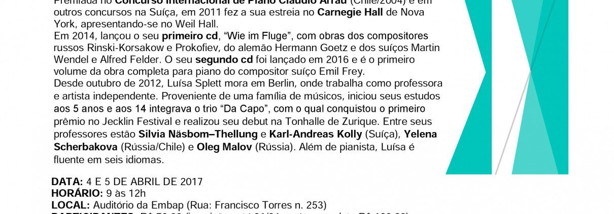 A Paideia tem o prazer de apoiar mais um materclass da Escola de Música e Belas Artes do Paraná! Desta vez, a pianista Luísa Splett será a convidada!